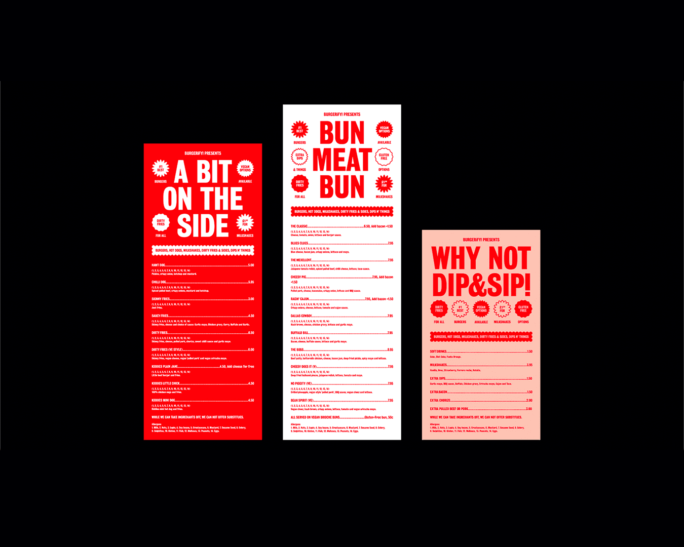 Burgerify is a no-nonsense burger joint that serves big food and flavours. Based in Dundalk, Ireland, after deciding to change directions into the burger industry, they came to us for a new look to re-launch. With a name already decided on, we used this name to become a verb ‘to burgerify’ something. To create a movement and mood associated with them, and their already growing social media platform. We matched this name with a punchy and strong brand that relied on cheeky copy, punchy type and graphics that implement a sense of texture and earthiness to a company that is all about food.